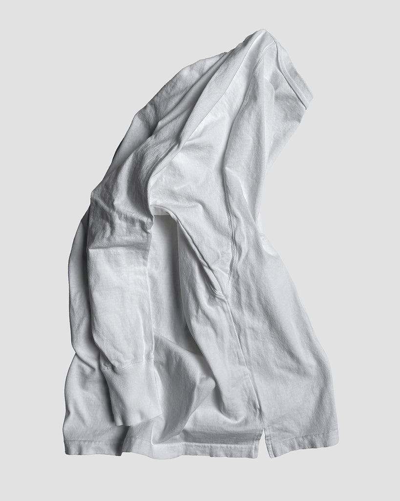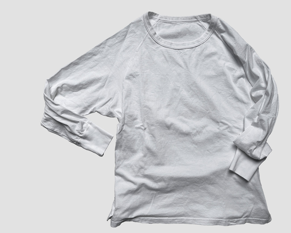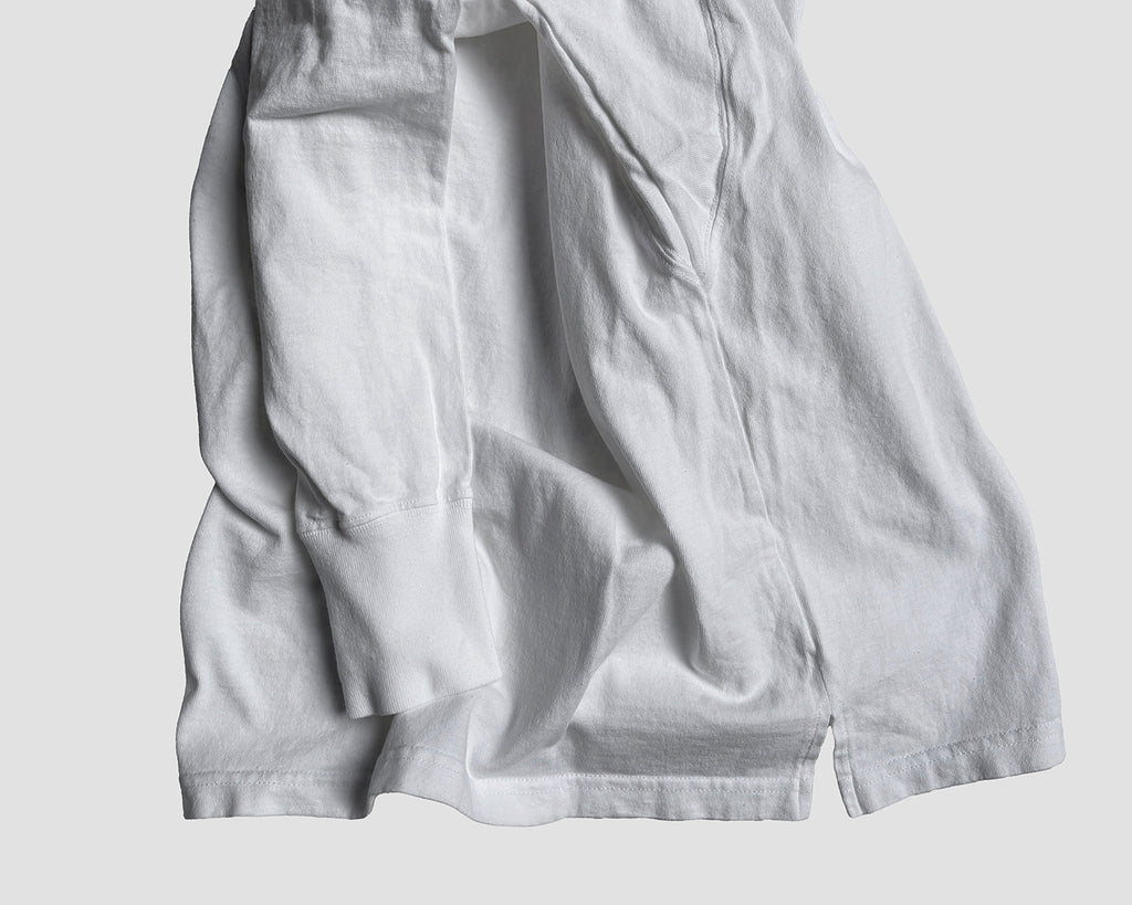 やや肉厚で秋口に重宝しそうな変形のラグランスリーブ長袖。脇下部分に空間ができる様にマチ分量が施され清涼感を感じられる仕様。全体的にゆとりあるシルエットで裾脇部分にはあきがあります。